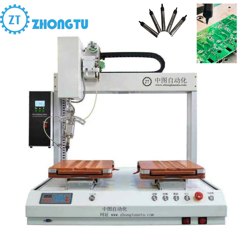 Advanced automatic soldering robot designed for precision soldering applications in manufacturing plants, SMT, and DIP processes. Features dual soldering heads and rotation axis for enhanced flexibility and productivity.